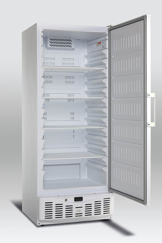 Yttre mått (HxBxD), mm: 1897x750x812\n Inre mått (HxBxD), mm: 1480x570x480\n Mått inkl. paketering (HxBxD), mm: 2000x790x760\n Brutto-/nettovolym: 540/459 L\n Brutto-/nettovikt: 108/92 kg\n Temperatur: 1 till 8°C\n Klimatklass: 4 (30°C-55%)\n Energiklass: D\n Energiförbrukning per 24h (kWh): 2,695\n Energiförbrukning per år (kWh): 984\n Lampa insida: Nej\n LED-display: Ja\n Fötter/hjul: 4 st\n Antal hyllplan: 4 st - GN 2/1\n Hyllmått (BxD), mm: -\n Justerbara hyllor: Ja\n Vändbar dörr: Ja\n Lås: Ja\n Självstängande dörr: Ja\n Kylmedel/mängd: R600a/70g\n Kylning: Ventilerad\n Kontroll: Elektrisk\n Effekt: 350w\n Spänning/frekvens: 220-240V/50\n Ljudnivå: level 65 dB(A)